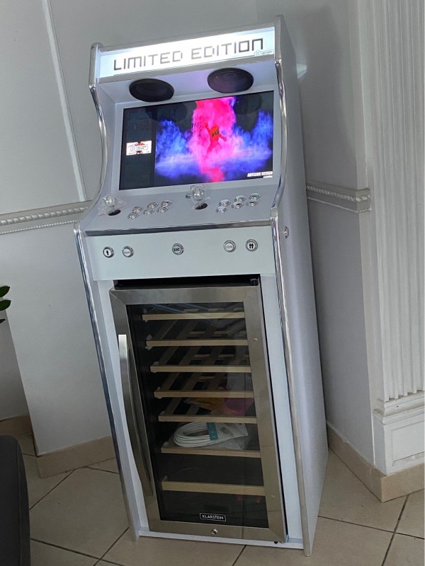 Art'cade Design est un produit unique qui allie une borne d'arcade personnalisée avec une cave à vins de 38 bouteilles.